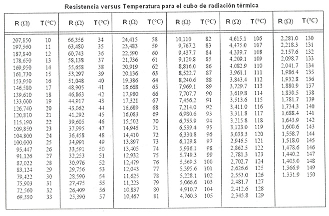 la temperatura del termistor (propia del cubo de radiación térmica) usando la
